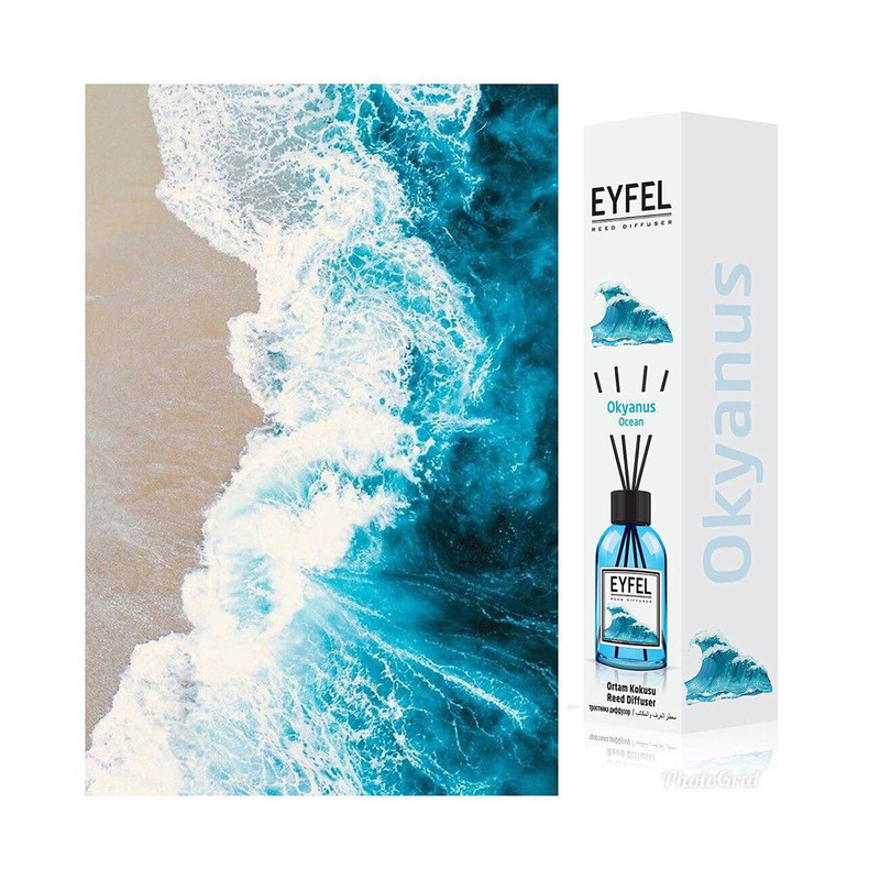 خوشبو کننده ایفل یک از معتبر ترین محصولات کشور ترکیه است. و یکی از برندهای محبوب خوشبو کننده چوبی در ایران می باشد. رایحه اقیانوس آبی یکی از خاص ترین رایحه های خشبو کننده ایفل میباشد . این خوشبو کننده از طریق چوب هایی که داخل ان قرار می گیرد در هوا پخش می شود.و با توجه به تعداد چوب هایی که در ان قرار می گیرد میزان بو و پخش رایحه کم و زیاد می شود. پخش بوی این رایحه همیشگی می باشد و تا زمان اتمام مایع داخل ظرف و معمولا از 3 الی 5 ماه تا خالی شدن مایع داخل ظرف (به تعداد چوب های داخل شیشه بستگی دارد) طول می کشد. باتوجه به وجود الکل چرب در این خشبو کننده لذا به ضدعفونی شدن هوا نیز کمک شایانی میکند . این محصول برای تمامی محیط ها مانند فروشگاه ها ، خانه و آشپزخانه ، سرویس بهداشتی ، دفاتر ، مطب ، ادارات ، داروخانه ها و . . . مورد استفاده قرار می گیرد.