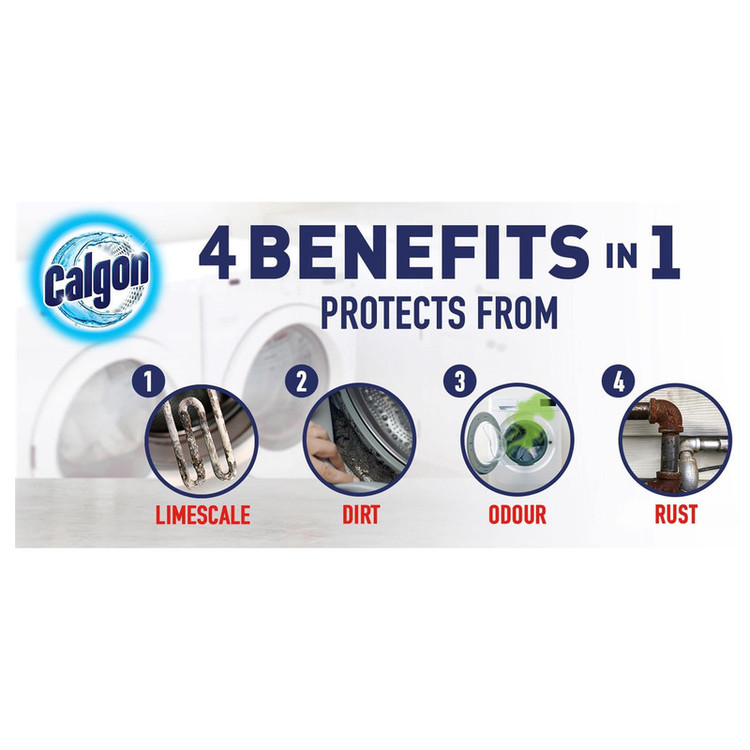 قرصهای جرم گیر کالگون 4u1 با حذف رسوبهای آهک و کمک به عمر طولانیتر ماشین لباسشویی، کارایی ماشین لباسشویی شما را افزایش میدهند. قابل ذکر است که استفاده از قرص جرم گیر ماشین لباسشویی کالگون بسیار راحت، بی دردسر و بدون ایجاد هیچگونه کثیفی است. مواد تشکیل دهنده قرص جرم گیر ماشین لباسشویی کالگون Calgon دارای فرمولاسیون منحصر به فرد پلی کربوکسیلیت است که سختی آب را گرفته و به طور فعال از همان دقایق اول شستشو در مقابل رسوبات آهکی و جرم و کثیفی محافظت می کند. اگر از قرص جرم گیر ماشین لباسشویی سه در یک کالگون استفاده نشود به مرور زمان رسوبات آهکی و باقی مانده مواد شوینده پشت درام، فیلتر و لوله ها تجمع می یابد. این موضوع نه تنها باعث کاهش عملکرد ماشین لباسشویی می گردد، بلکه بوی نامطبوعی ایجاد کرده و مانع یک شستشوی عالی و بی عیب می گردد. تمیز بودن فیلتر به مصرف کم انرژی کمک شایانی می کند.